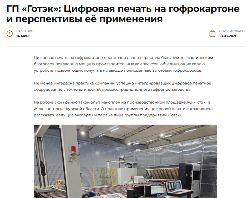 На отраслевом портале Гофро.орг опубликована статья, посвященная опыту применения цифровой печати на гофрокартоне в группе предприятий «Готэк». В материале раскрыты вопросы интеграции цифрового печатного оборудования в традиционное гофропроизводство, экономики цифровой печати в сравнении с флексографской и офсетной технологиями, а также особенностей работы с оборудованием производителя Hanway. Эксперты компании рассказали о практике работы с клиентами, подходах к разработке упаковочных решений и перспективах развития направления.
